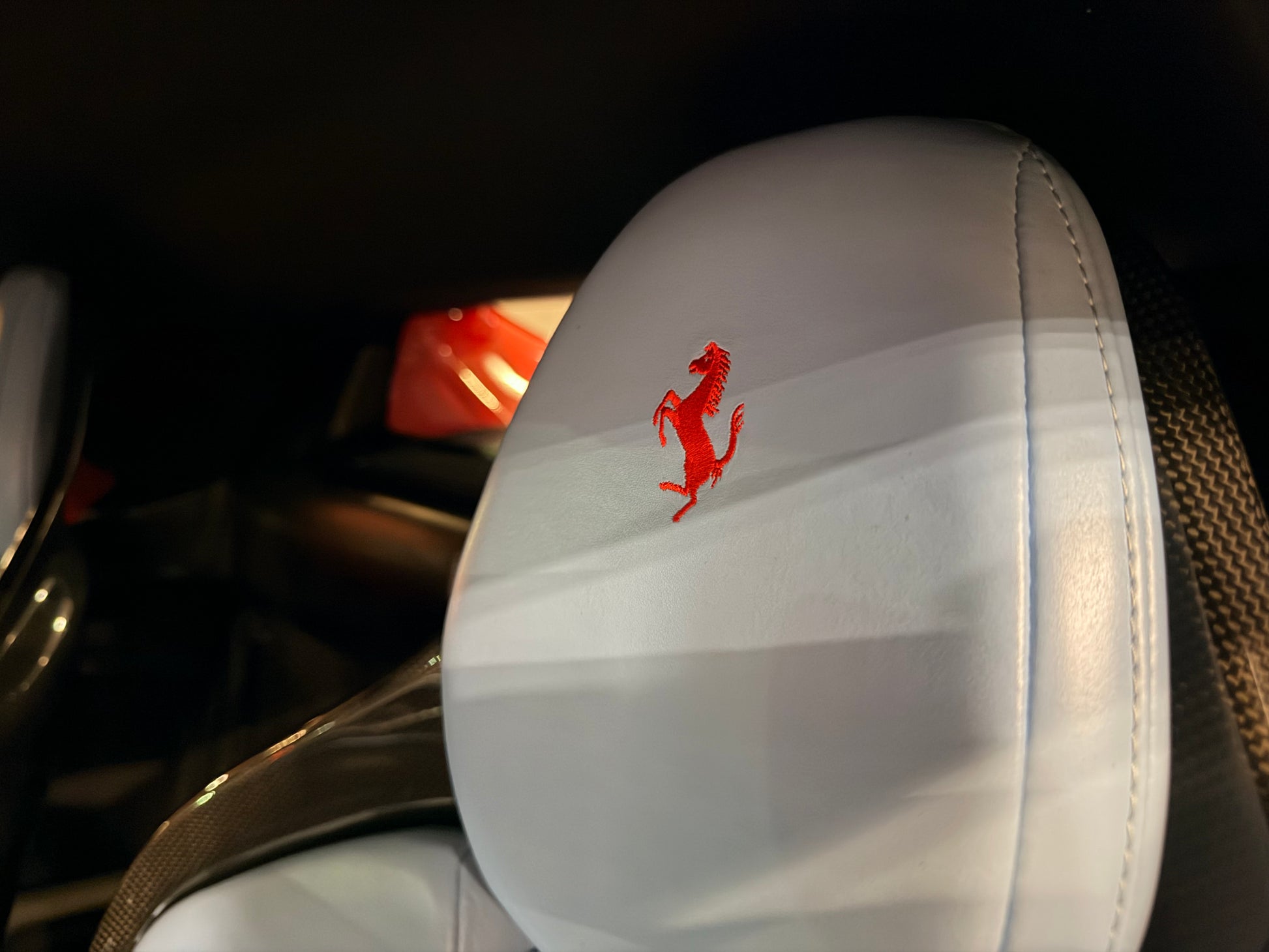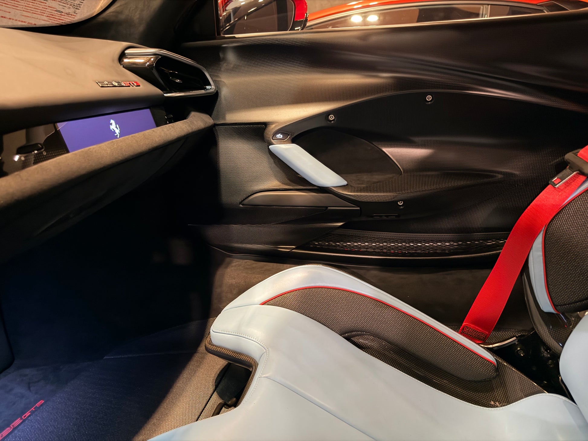 座椅上亦有黑色Superfabric Tilobato特殊材質設計,兩種材質銜接處做Rosso Ferrari色皮革鑲崁}